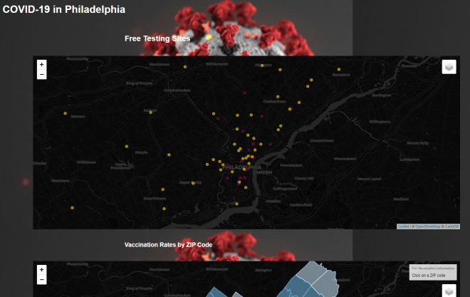 The web map itself hosts 3 different maps, all referring to covid-19 related information; Testing Sites, Vaccination Rates, and Death Rates. Leaflet was utilized and each map itself has a number of interactive elements. That being said, I feel it is best for the maps to be explored themselves, Click here to explore the web maps!