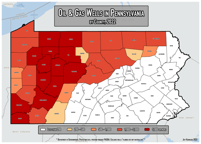 - With technological advances in natural gas, oil and gas wells have exploded with growth across the state of Pennsylvania. Total wells in 1996 were 67,271 and in 2022 there are 200,687.