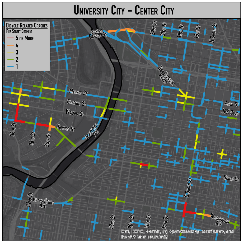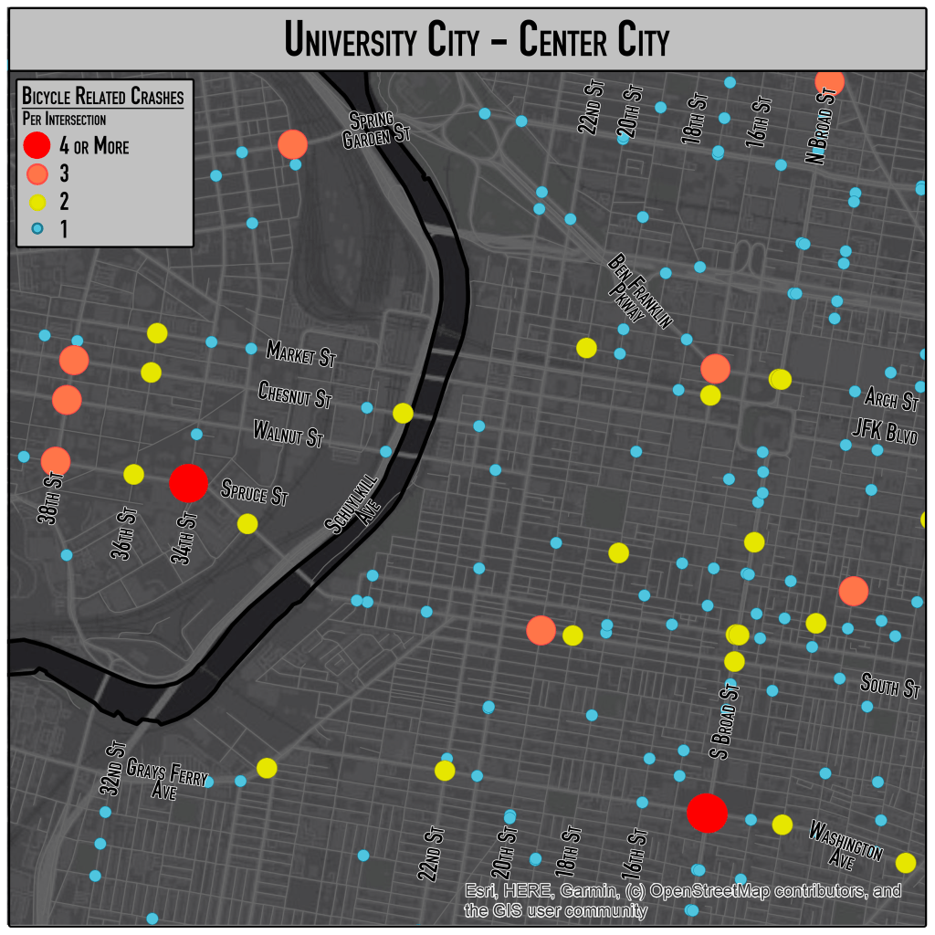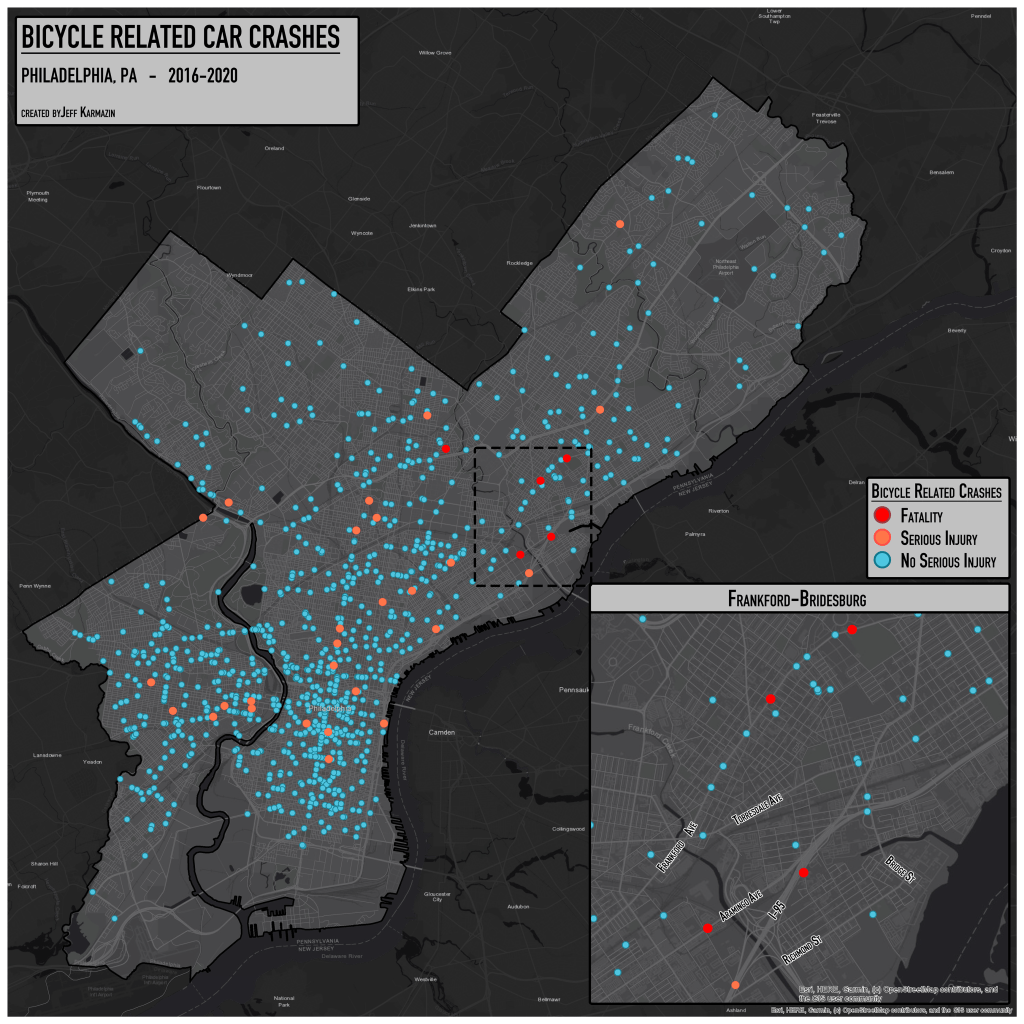 First, five years (2016-2020) of Pennsylvania car crash data were gathered to ensure a large enough sample to analyze crash patterns. The Pennsylvania car crashes were loaded in through ArcGIS and then selected out to only include car crashes that occurred within Philadelphia County. These car crashes were further filtered to only display those that involved at least one bicycle. These bicycle related crashes (BRCs) were then symbolized on whether the BRC resulted in a bicyclist suffering a severe injury, or resulted in a bicyclist fatality.